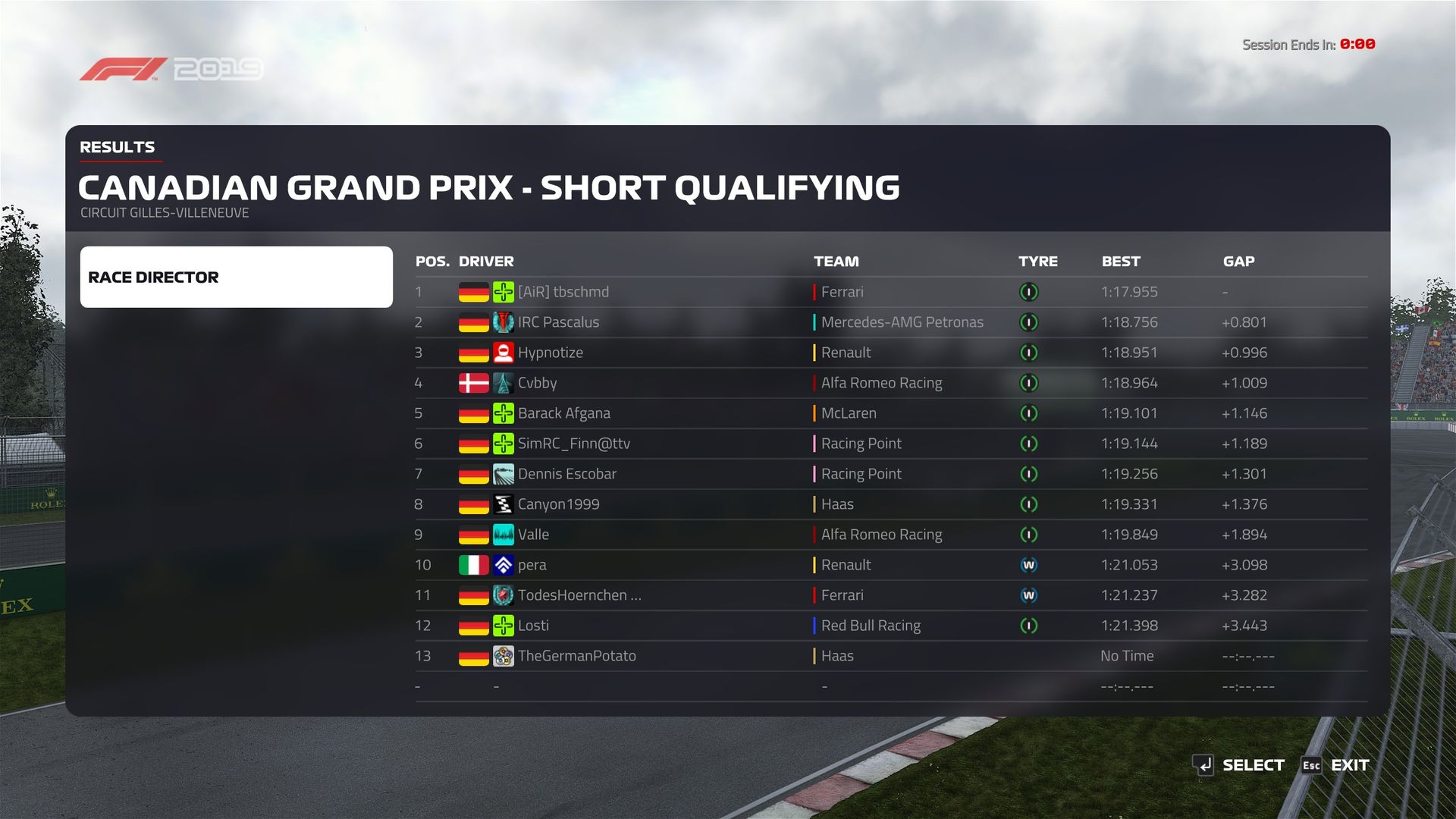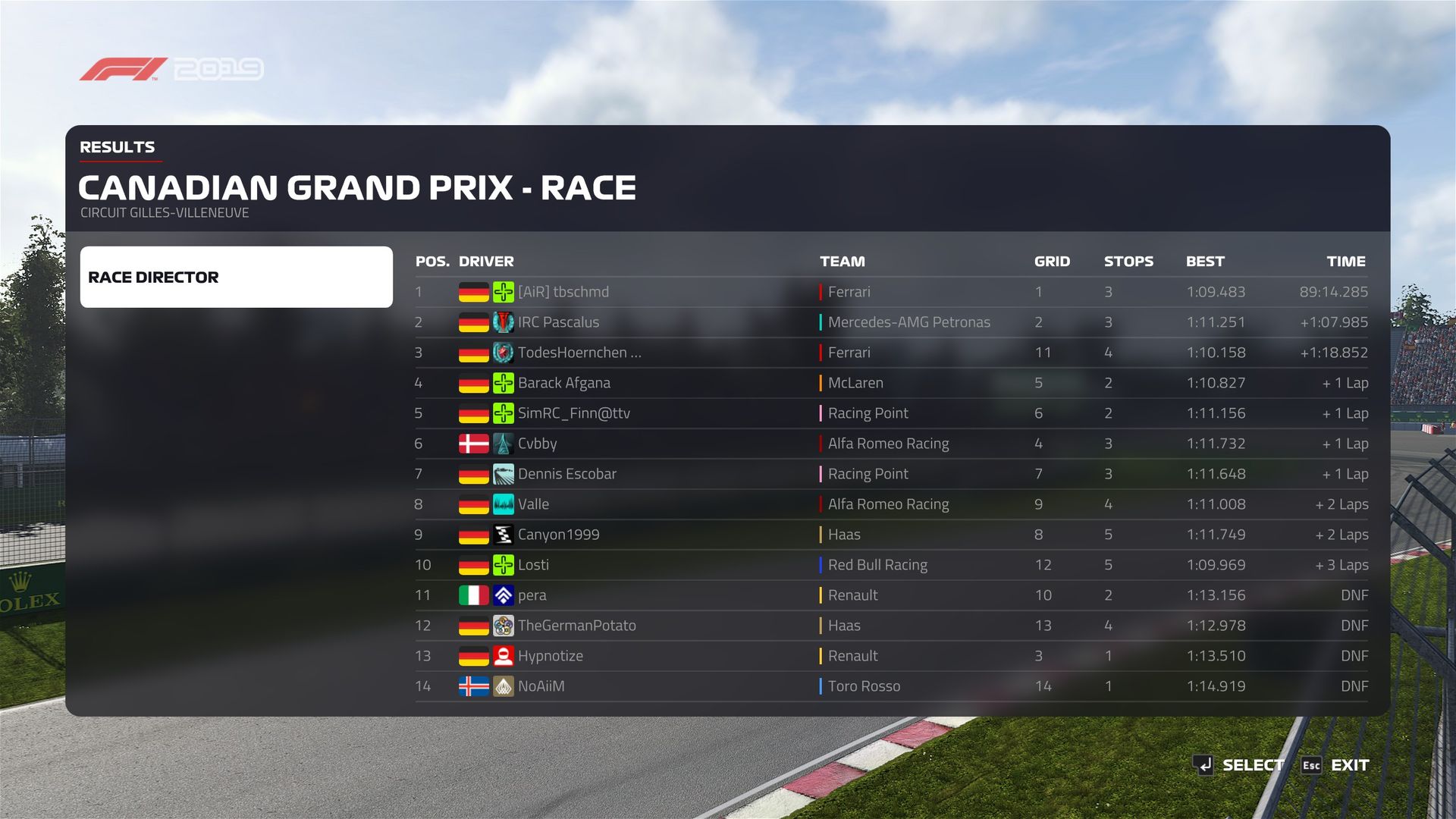 Irgendwann waren meine Reifen zu sehr abgenutzt, hatte ein kleines Stück meines Frontflügels verloren (ich weiß aber nicht wo und wann) und konnte beide nicht mehr halten. War dann einsam auf P6. Bin dann in die Box für neue Softs. Hab dann gepusht. Hab irgendwann zu viel vom Innenkurb in der vierten Schikane genommen, hab mich gedreht und bin dann direkt in die Mauer geprallt. Naja, diese scheiß Schikane. In Assetto Corsa hab ich mich dort noch nie gedreht, aber in F1 2019 tausend mal. Das Auto wird dort so instabil in F1 2019, es ist unglaublich ey.