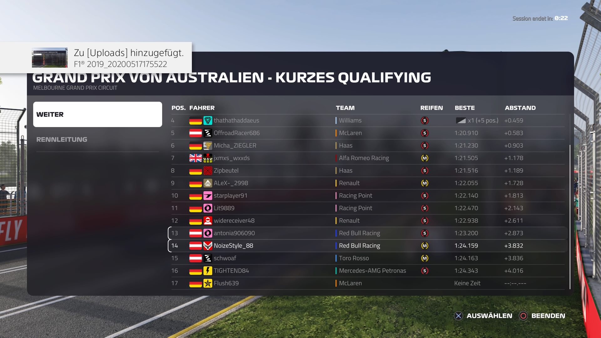 Qualifyingergebnis: Ergebnis (z.B. P8) und Rundenzeit (z.B. 1.22.564)