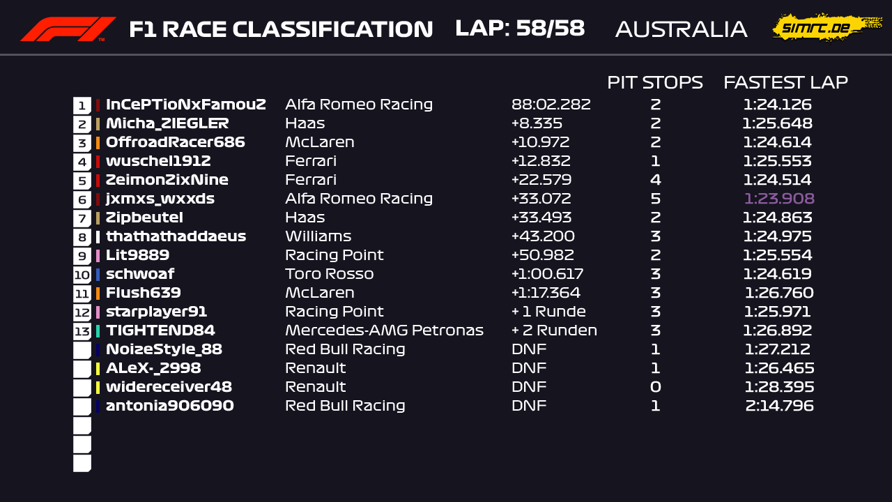 Rennen: Kurzer Text zum Rennen ( Vorfälle, besondere Überholmanöver, Gedanken zu Boxenstops, Undercuts usw.)