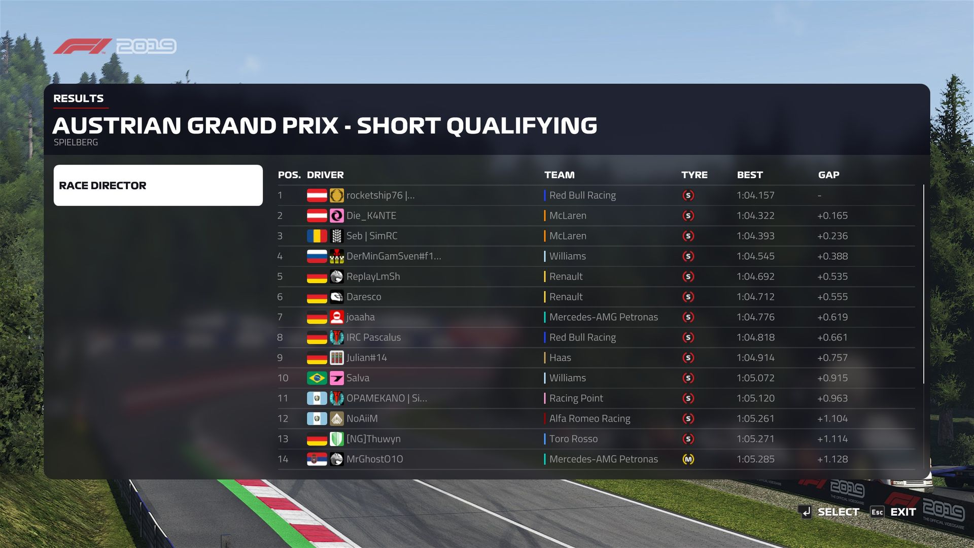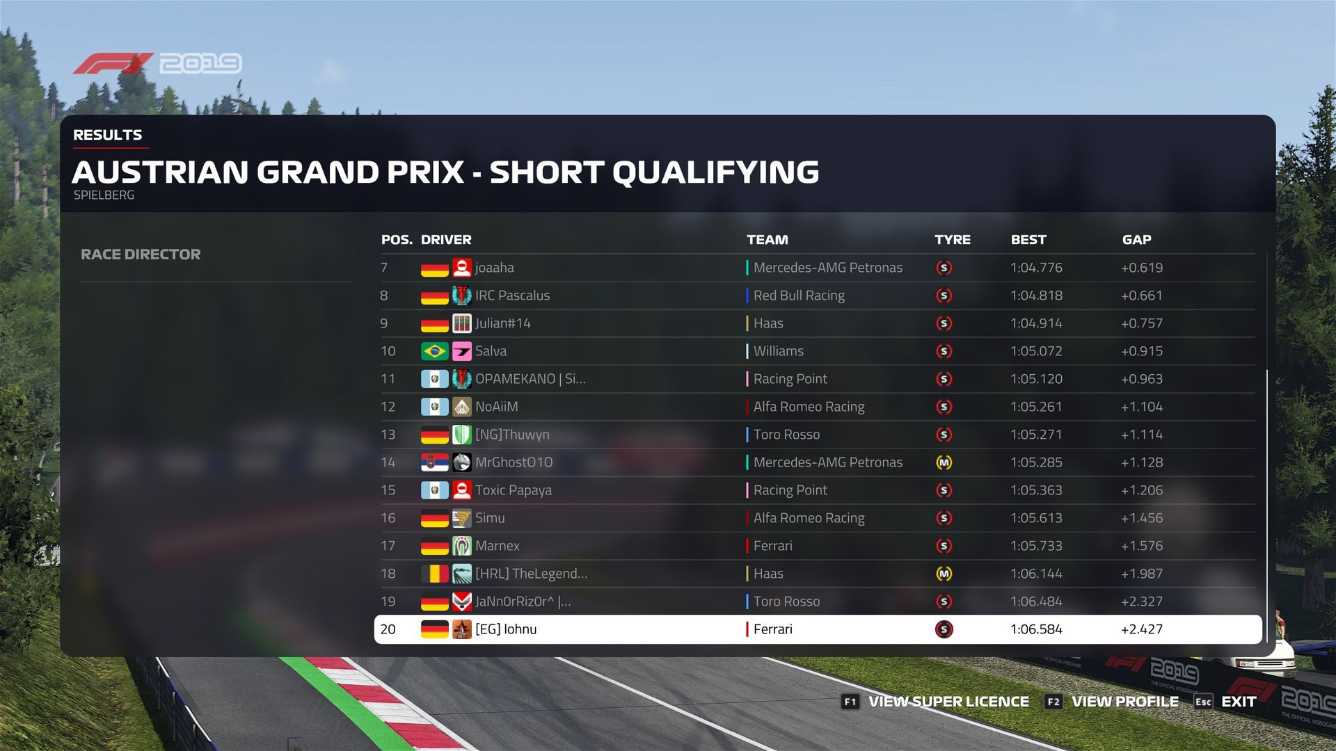 Rennen: Der Start war mal wieder Chaos ohne Ende, in Turn 1 kam dann auf einmal @Salva von rechts quer angeflogen, aber wie durch ein Wunder kam ich ohne Schaden durch, guckt euch das mal an :D