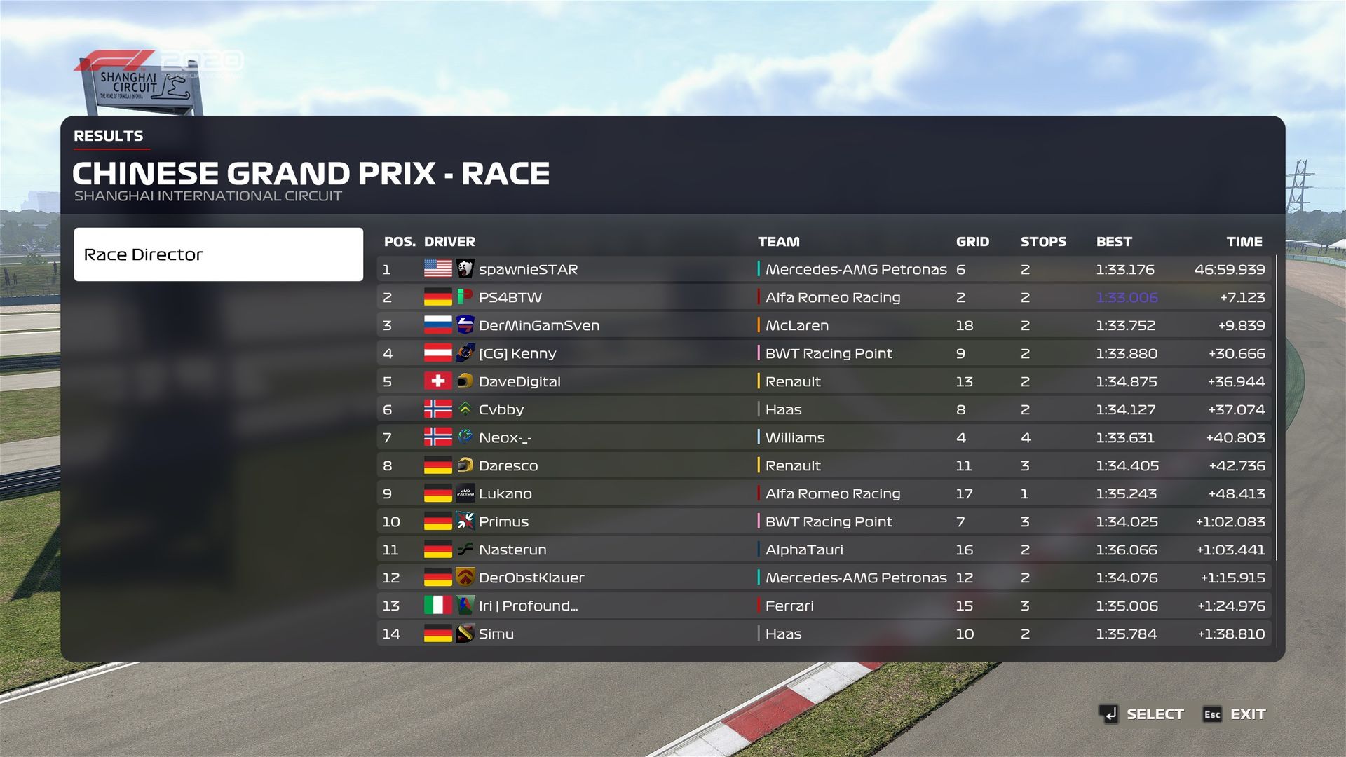 Rennen: guter Start, erstes VSC für meine geplante Strategie verwendet und auch danach eine recht ordentliche pace gehabt. Das SC hat mich zwei Sekunden zu spät erwischt, sonst wäre es wohl anders gelaufen... So eine Runde hinter dem SC und beim Boxenstopp noch zusätzlich ne Menge Zeit warten müssen. Aber danach war es nur noch verbugt. Musste plötzlich jemanden vorbeilassen, er vermutlich wieder mich... Nahm dann die 5sek in Kauf, bringt ja nichts. Dann das selbe Spiel auch noch bei Die_Kante und dann hat sich auch noch das Spiel verabschiedet.