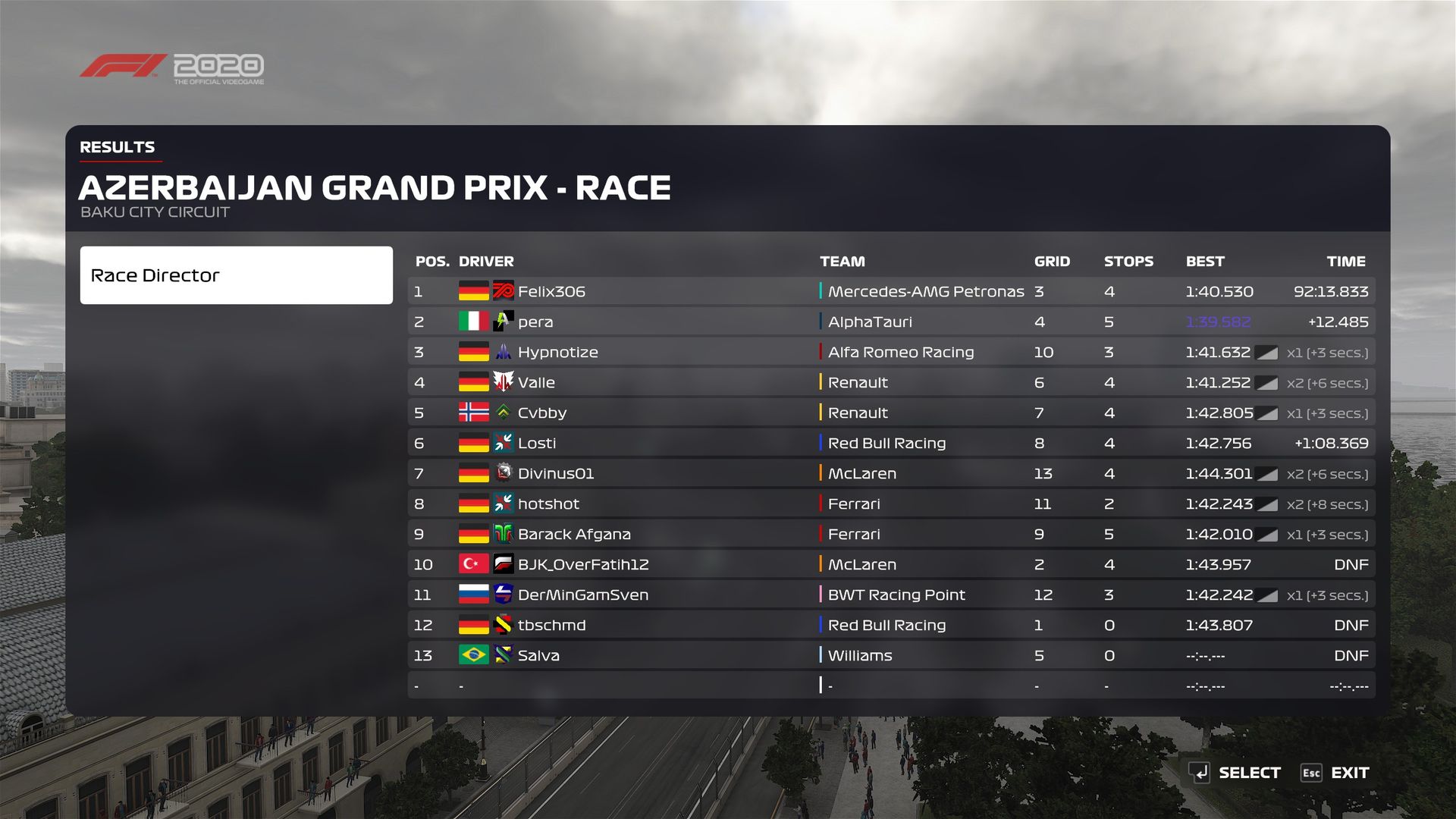 Rennen: Extrem guten Start gehabt. In Turn 1 etwas zu spät gebremst und in die Seite von Felix306 gerutscht. Dann wurde ich von hinten in nen Spin angeschubst. Schönen 360 gemacht und nicht weit hinterm Feld geblieben. Gut was aufgeholt. Recht früh an die Box gegangen, da mir die Softs nicht gefallen haben zum Fahren und ich eh 2 Mal Mediums fahren wollte. Durch das SC wieder am Feld dran gewesen. Dann mussten einige Topfahrer an die Box und ich war auf P4 hinter Losti und Barack Afgana. Barack hab ich überholt. Als ich aber bei Losti war, hat er mich in der Bremszone von T3 frech in die Wand gedrückt und mir beim Exit der Kurve keinen Platz gelassen obwohl wir Side by Side in die Kurve gegangen sind. Habe dadurch nen unnötigen Flügelschaden bekommen. Gibt keine Beschwerde, aber das nächste Mal ein wenig Platz lassen Losti. In der Box meinen zweiten frischen Satz Mediums genommen und vor gehabt ins Ziel damit zu fahren. 3 Runden später mach ich den Leclerc. Habe ein Lock Up beim Entry der Castle Sectio und verliere meinen Flügel. Losti fährt mir hinten rein und auch Valle knallt hinten rein. An die Box und Softs genommen um mit Doppelsoft ins Ziel zufahren, da ich dachte, beide Mediumsätze wären zu kaputt um ins Ziel zu kommen. Habe etwa 15 Sekunden Vorsprung auf Losti gehabt. Irgendwann kam ein VSC Mal perfekt für mich. Ich konnte an die Box und kam noch vor Losti wieder raus.