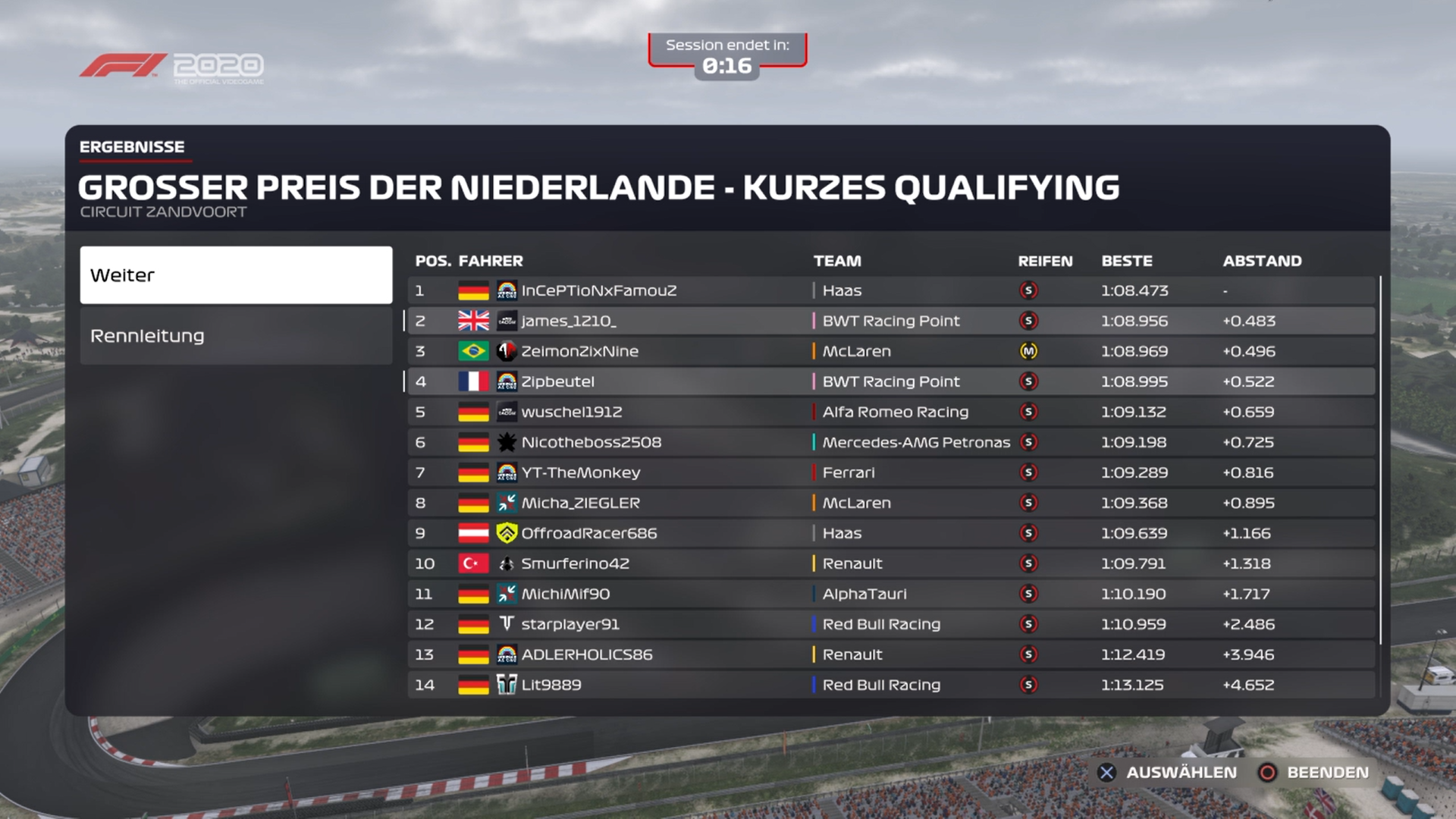 In Runde 59 konnte ich dann durch den Fehler von Lit9889 auf P9 zurück. In Runde 61 musste ich dann wieder in die Box für Regenreifen. Leider hat er diese aber nicht ausgewählt gehabt und er hat mit die :soft: aufgezogen :emojiSmiley-44:. Also in Runde 62 noch mal rein und dann die richtigen Reifen :inter: geholt. Glücklicherweise musste Lit9889 zum Flügeltausch auch noch mal an die Box, sodass ich P9 behalten konnte und diesmal in Ziel retten konnte. Daraus wurde P8, da der Ghost ja noch aus der Wertung genommen wurde.