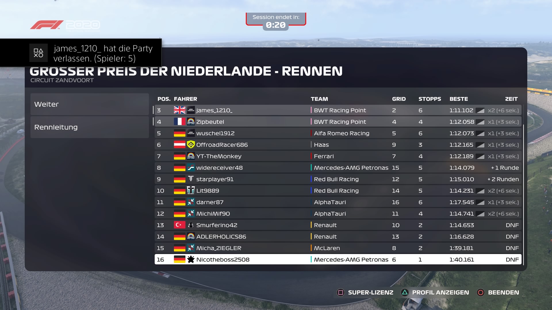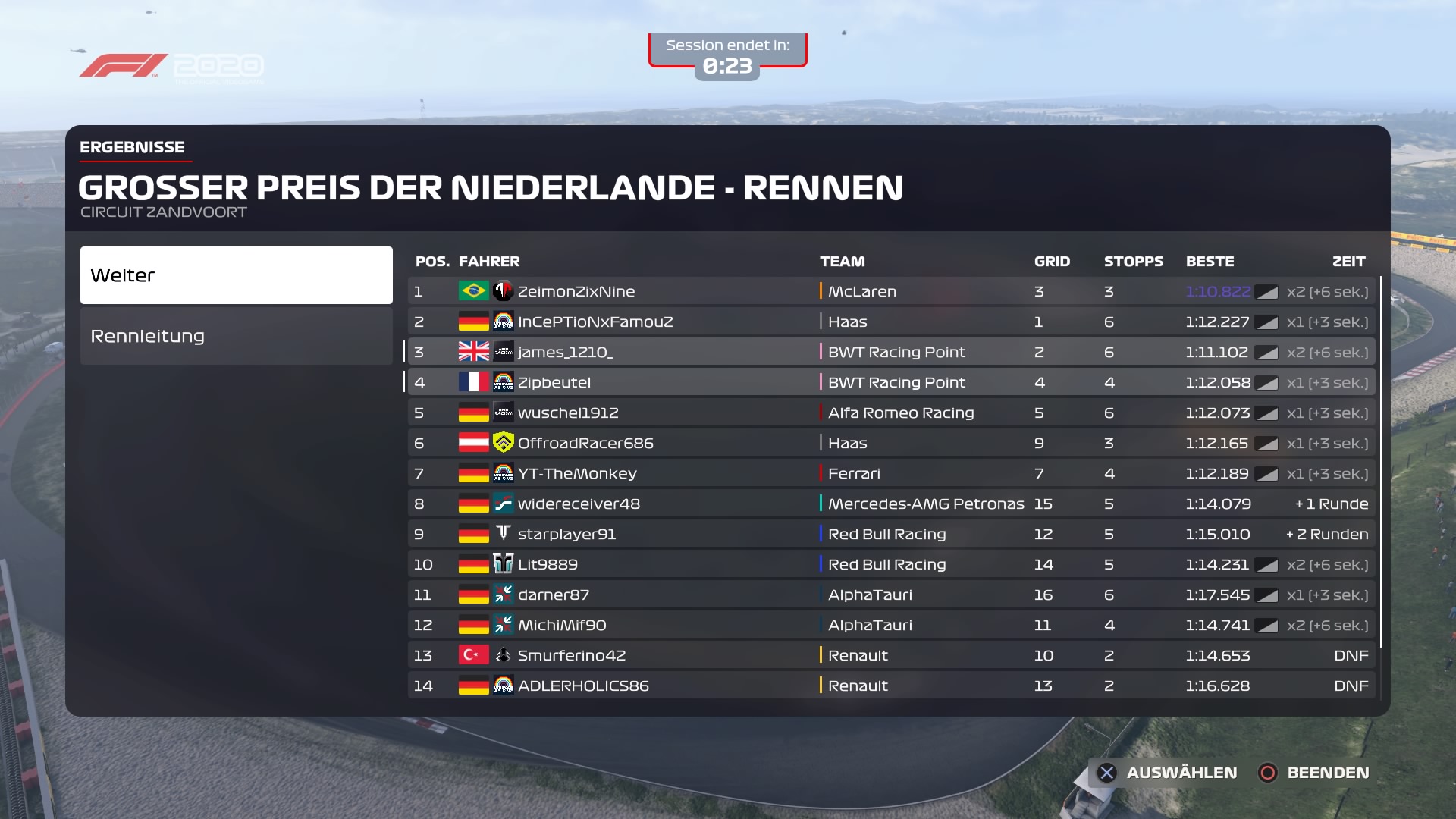 Rennen: Beim Start die Position verteidigt und dann erstmal ne Weile entspannt auf P4 geblieben. Als das 2. Safety-Car kam in die Box gefahren auf Inters. Dann bin ich während des SC kurz auf Toilette gegangen und habe die KI fahren lassen. Die KI hat dann beschlossen, nochmal in die Box zu fahren um neue Inters zu holen (die Inters die ich drauf hatte waren schließlich schon 1 Runde alt :facepalm:). Dadurch dann hinter OFFROADRACER686 auf P5 rausgekommen. Wir hatten dann einen sehr schönen Fight und ich konnte ihn auch kurz vor Ende des Regens überholen (nach dem wir die halbe Runde Side-by-Side gefahren sind). Leider wurde ich beim Boxenstopp auf Trockenreifen aufgehalten, da mein Teammate vor mir ebenfalls in der Box war.