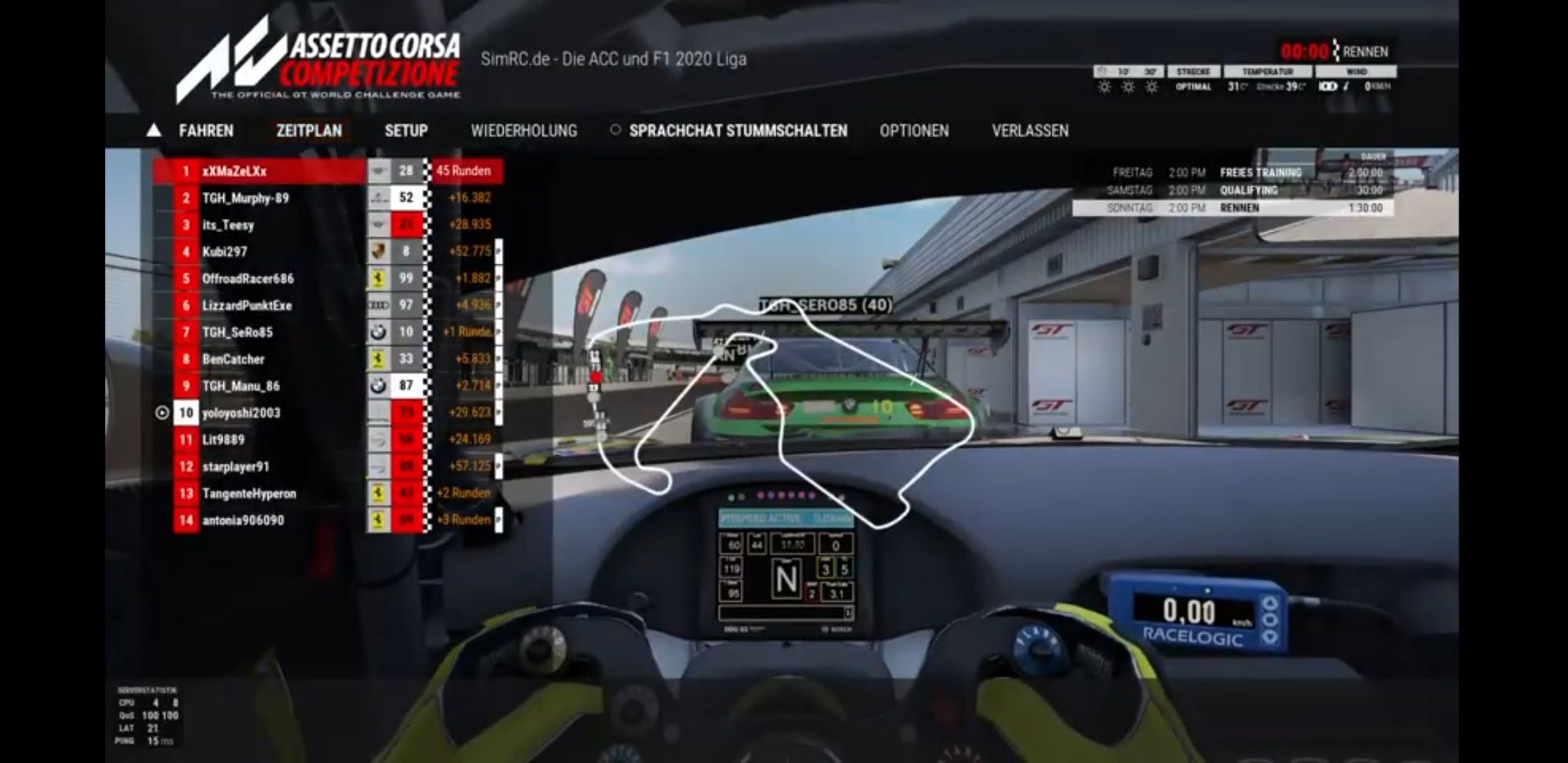 Qualifying: komplett versemmelt das Quali. Im Porsche immer mit vollem Tank geübt, ohne Sprit kam das Heck in jeder Kurve. Musste dann das Setup ein wenig umstellen und mich erstmal wieder einfahren. Dann keine wirklich gute Runde hinbekommen und weit abgeschlagen auf P7.