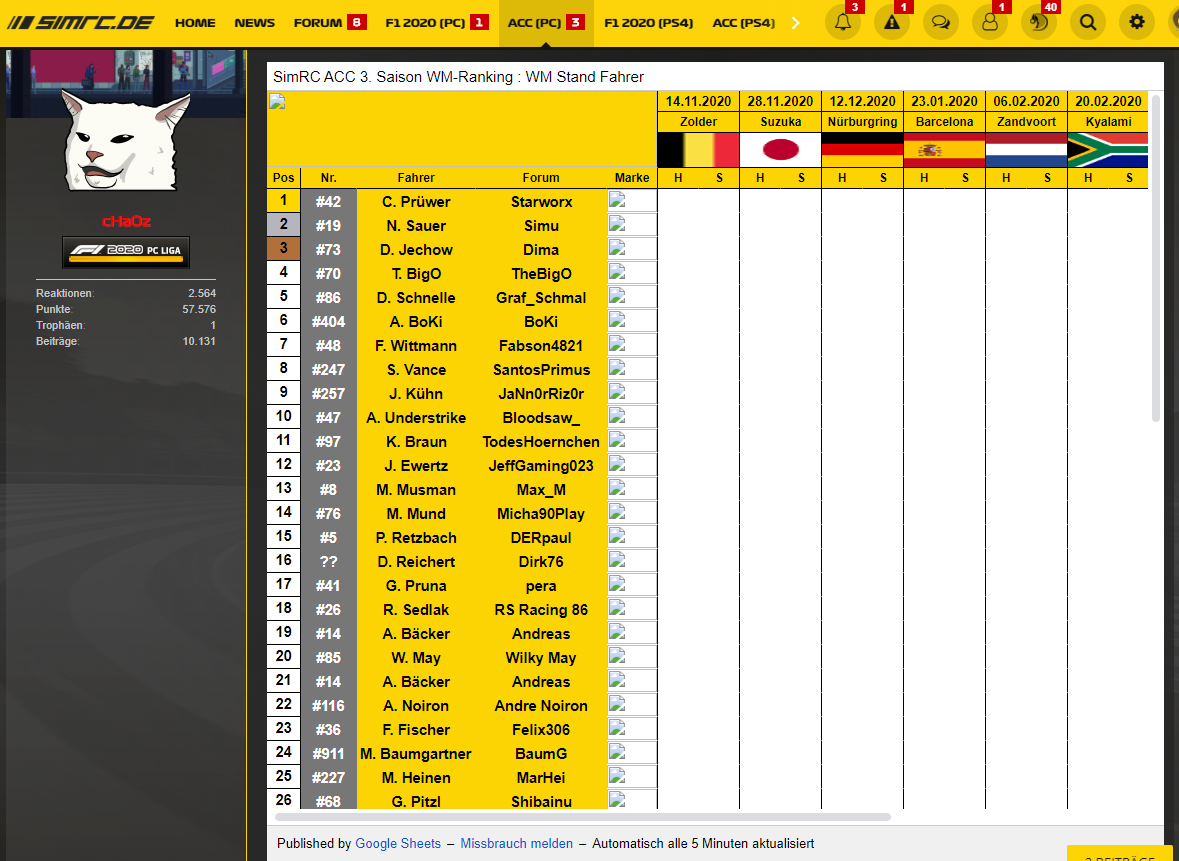 Die Ligaleitung steht für Fragen unserer Neuen im entsprechenden TS-Channel bereit.ca. 18:00 Uhr Qualifikation (20 Minuten Q.-zeit + 5 Minuten Pause nach dem Q.) ca. 18:25 Uhr Hauptrennen (55 Minuten Rennzeit + 5 Minuten Einführungs- und Abschlussrunde) ca. 19:30 Uhr ca. 10 Min Pause ca. 19:40 Uhr Sprintrennen (30 Minuten Rennzeit + 5 Minuten Einführungs- und Abschlussrunde) Es wird empfohlen sich das Regelwerk und den Strafenkatalog gründlich durchzulesen!