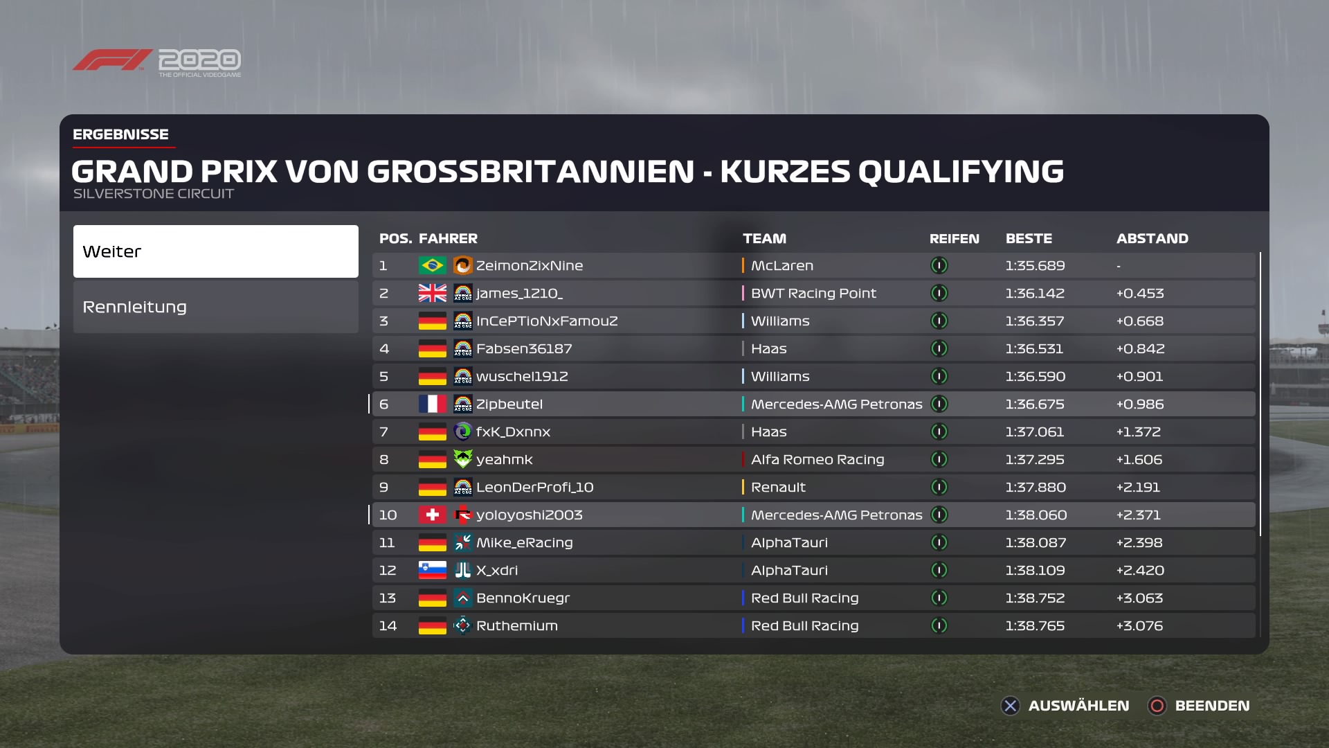 Qualifying: Sehr schwieriges Qualifying, da ich im Regen überhaupt kein Gefühl hatte und nicht wusste wo das Limit ist. Letzte Runde wurde dann mit 6 Zehnteln im Delta wegen Track Limits gestrichen...