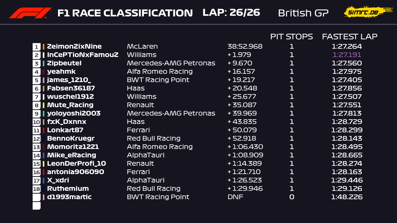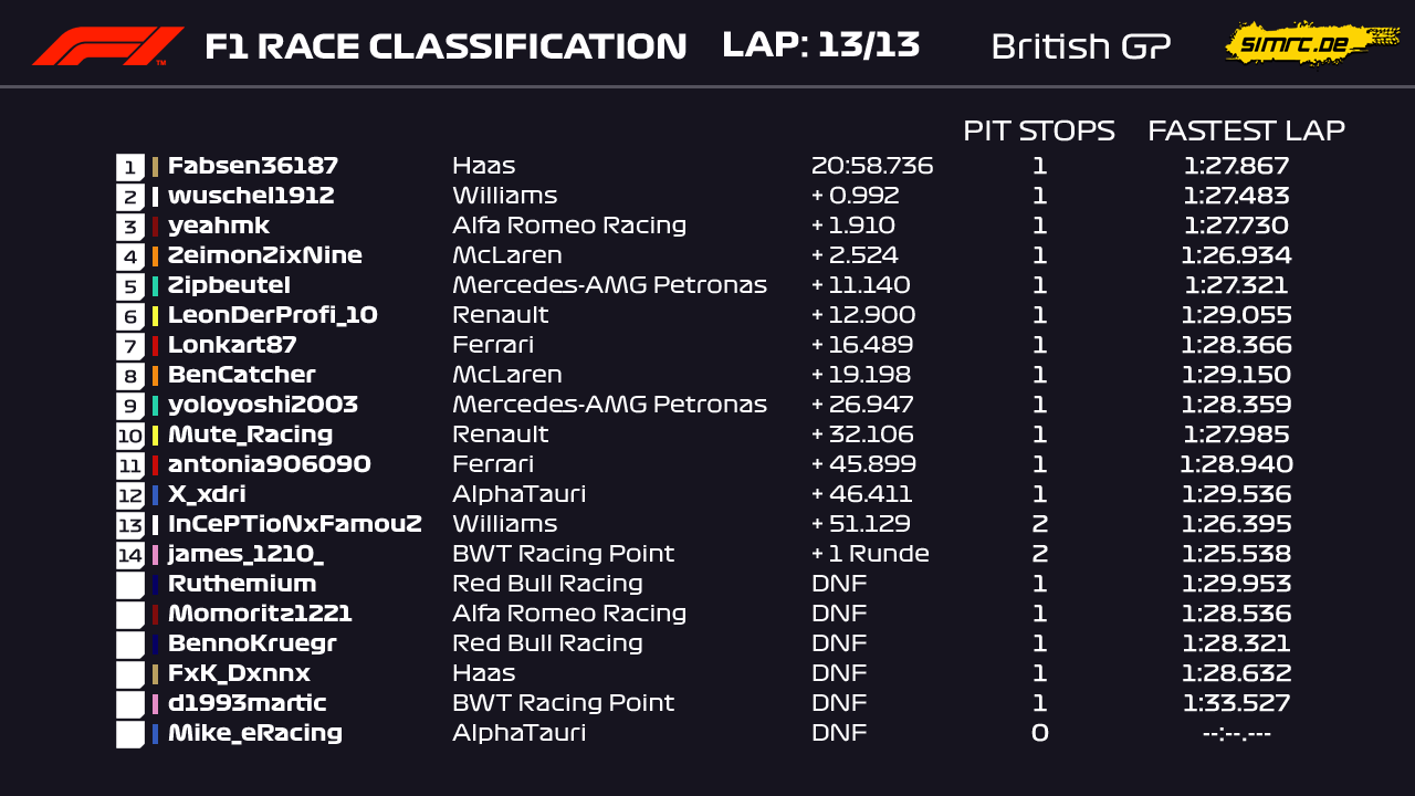 Durch viele Unfälle vor mir konnte ich in den ersten paar Kurven von P14 auf P8 vorfahren. Da ich mit einem Safety Car gerechnet hatte und auf Medium gestartet bin, konnte ich sehr profitieren, da ich den Rest des Rennens auf Soft fahren konnte. Ich war dann am Ende der Safety Car Phase auf P5 mit zwei Fahrern vor mir, welche noch nicht in der Box waren. Die beiden anderen konnte ich recht schnell überholen, da ich die besseren Reifen hatte. Durch das VSC haben dann noch zwei Konkurrenten eine Durchfahrtsstrafe bekommen, wodurch ich dann ab Runde 6 alleine davon fahren konnte. Erst in den letzten paar Runden sind die Softs eingebrochen und ich bin nicht mehr das Risiko einer Zeitstrafe eingegangen, wodurch Marcel2502 dann noch ein bisschen rangekommen ist. Gefährdet war der Sieg aber nie.