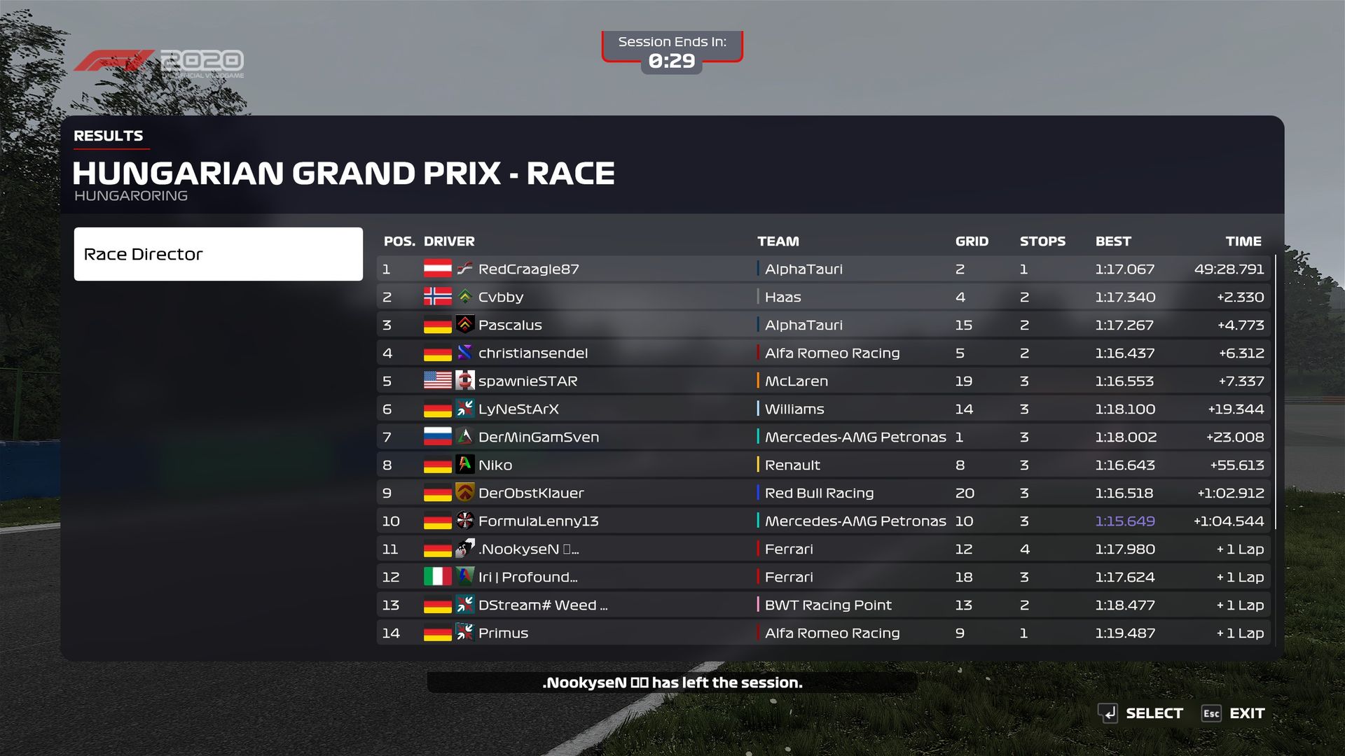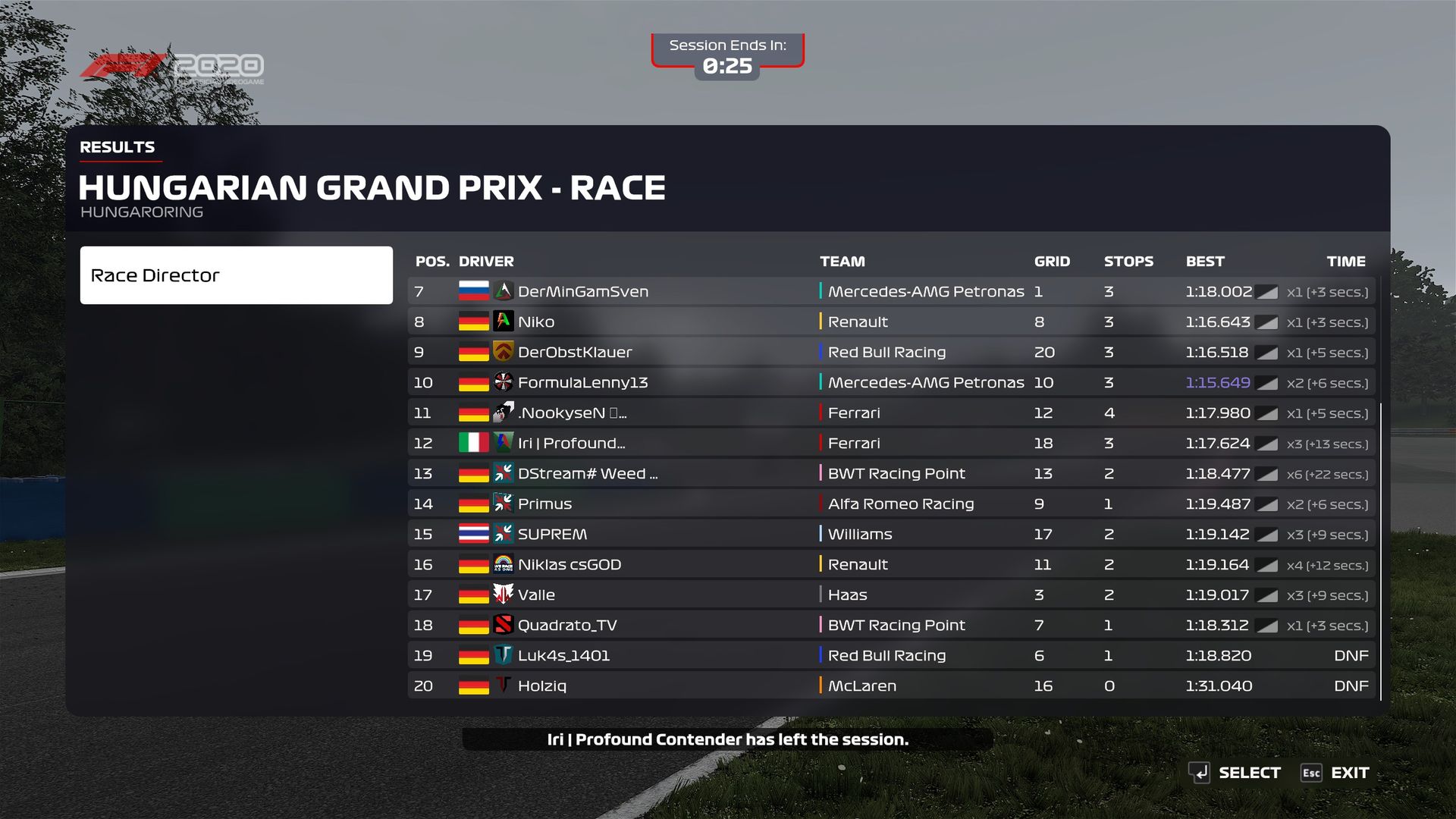 @Luk4s_1401 ganz leicht berührt habe. Ich denke er hat es nicht mal bemerkt. Die 5 Sekunden Strafe habe ich dann zu meinem ersten Boxenstopp absitzen müssen. Nach den 5 Sekunden hat aber meine Boxenstopp Crew nicht angefangen die Räder zu wechseln sondern erst so ca. nach 9 Sekunden. Der Boxenstopp hatte letztendlich um die 13 Sekunden gedauert (reine Standzeit). Nach dem ich aus der Box raus kam stand auf einmal ein Mercedes quer in Kurve 1, dem ich auch nicht mehr ausweichen konnte, weil es absolut unerwartet war und auch keine gelbe Flagge signalisiert war. Später im Stream habe ich gesehen, dass gar kein Mercedes sich dort gedreht hat, sondern er scheinbar nur bei mir dort quer stand. Auf jeden Fall war mein Flügel im Arsch und ich konnte gleich wieder in die Box. Rest des Rennens ist nichts mehr großartiges passiert.