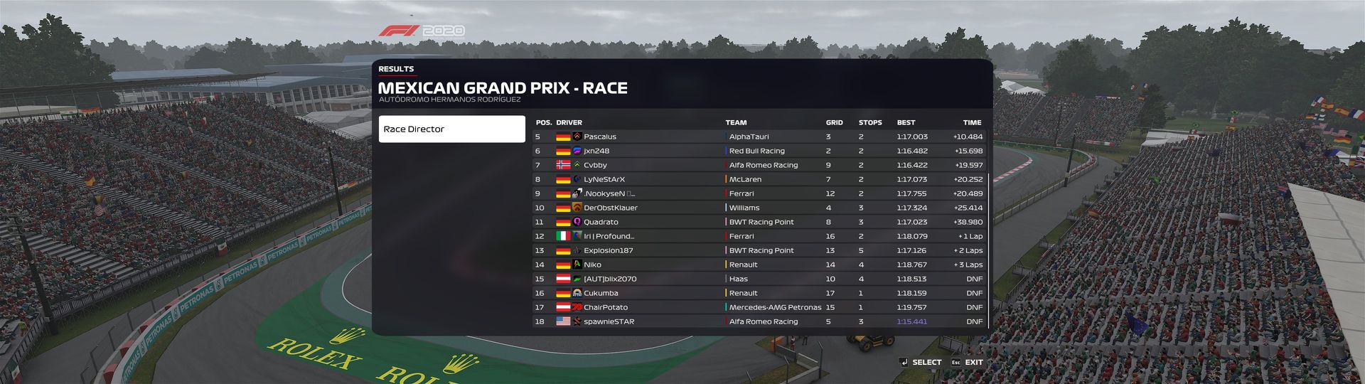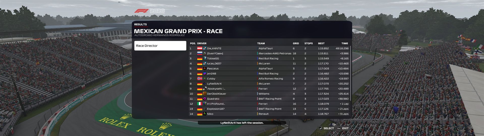 Rennen: Start ganz gut gemeistert. Leider nicht den Anschluss an Pascalus und Quadrato gehalten. Dadurch etwa 3-4 Sekunden hinter denen hergefahren. Auf den Mediums dann recht schnell an Pascalus rangeflogen, 2 Runden hinter ihm ERS und Benzin gespart und vorbeigedüst und instant ausm DRS-Fenster rausgefahren. Auf Quadrato habe ich auch ordentlich gegained. Wollte ihn dann beim 2ten Stopp Overcutten. Aber er hat sich eh einen 5er geholt. Dann kam mal wieder ein Safety Car, was mir mein komplettes Rennen zerstört. Nachm SC versucht an @jxn noch vorbeizukommen und zu hoffen, er cuttet noch genug, aber DerMinGamSven macht sich dort unendlich breit und zerstört mir dadurch da die chance, obwohl er eh sicher auf P2 gelandet wäre im Ziel, egal ob vor oder hinter mir.