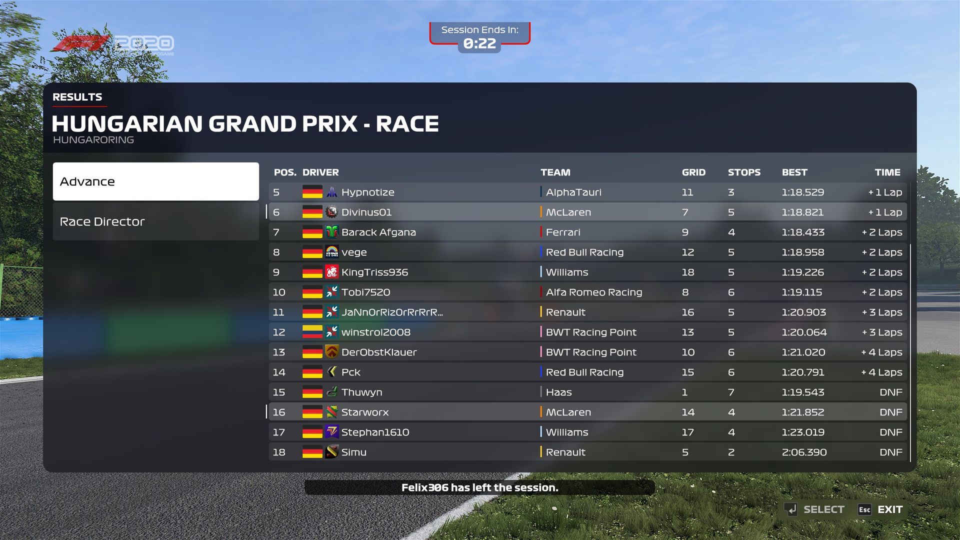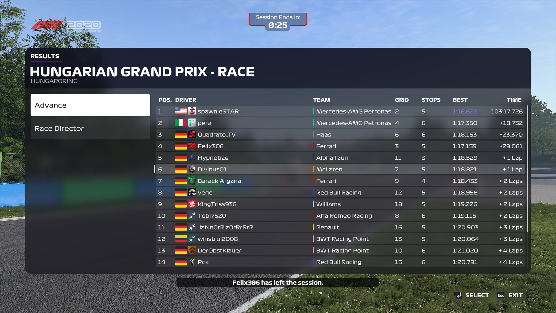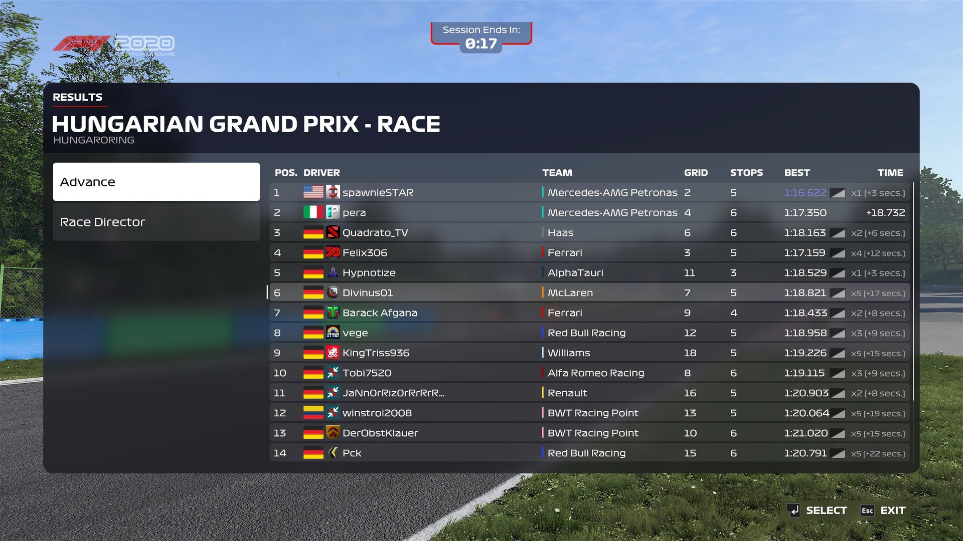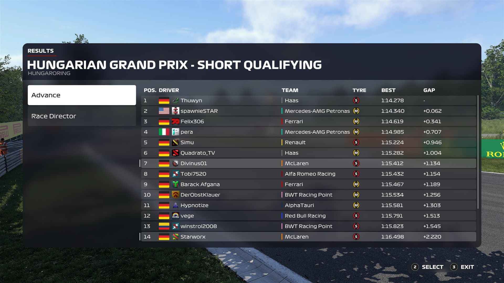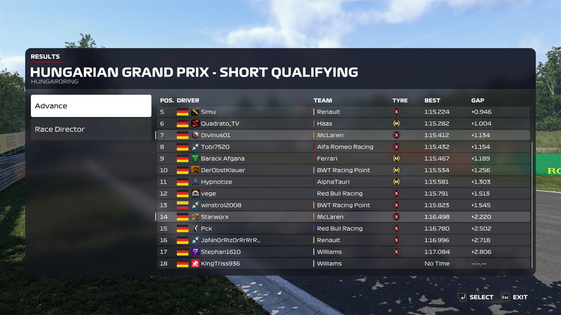 vor. Danach gings bergab. Drei Dreher in Felipe 2 (da ich das Memo, den Randstein nicht zu berühren, nicht erhalten habe) und einer im Hickhack beförderten mich auf den vorletzten Platz zurück.