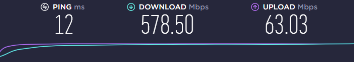 Antwort: Ping: 12ms; Download: 578.50 Mbps; Upload: 63.03 Mbps