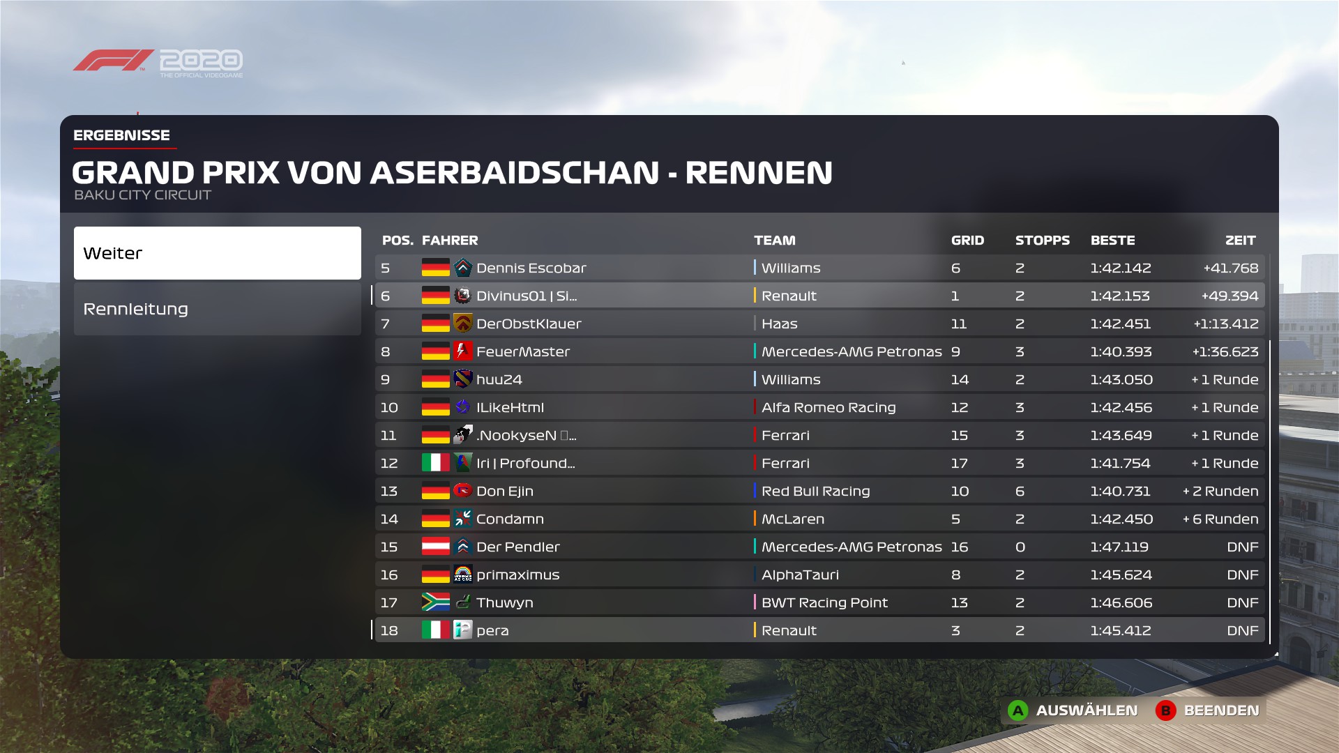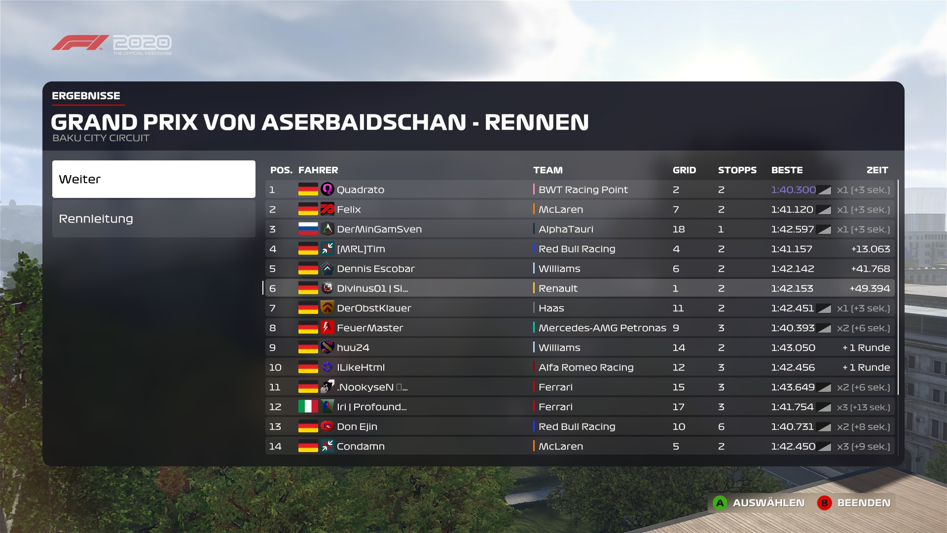 Rennergebnis: Endplatzierung im Rennen (z.B. 5)