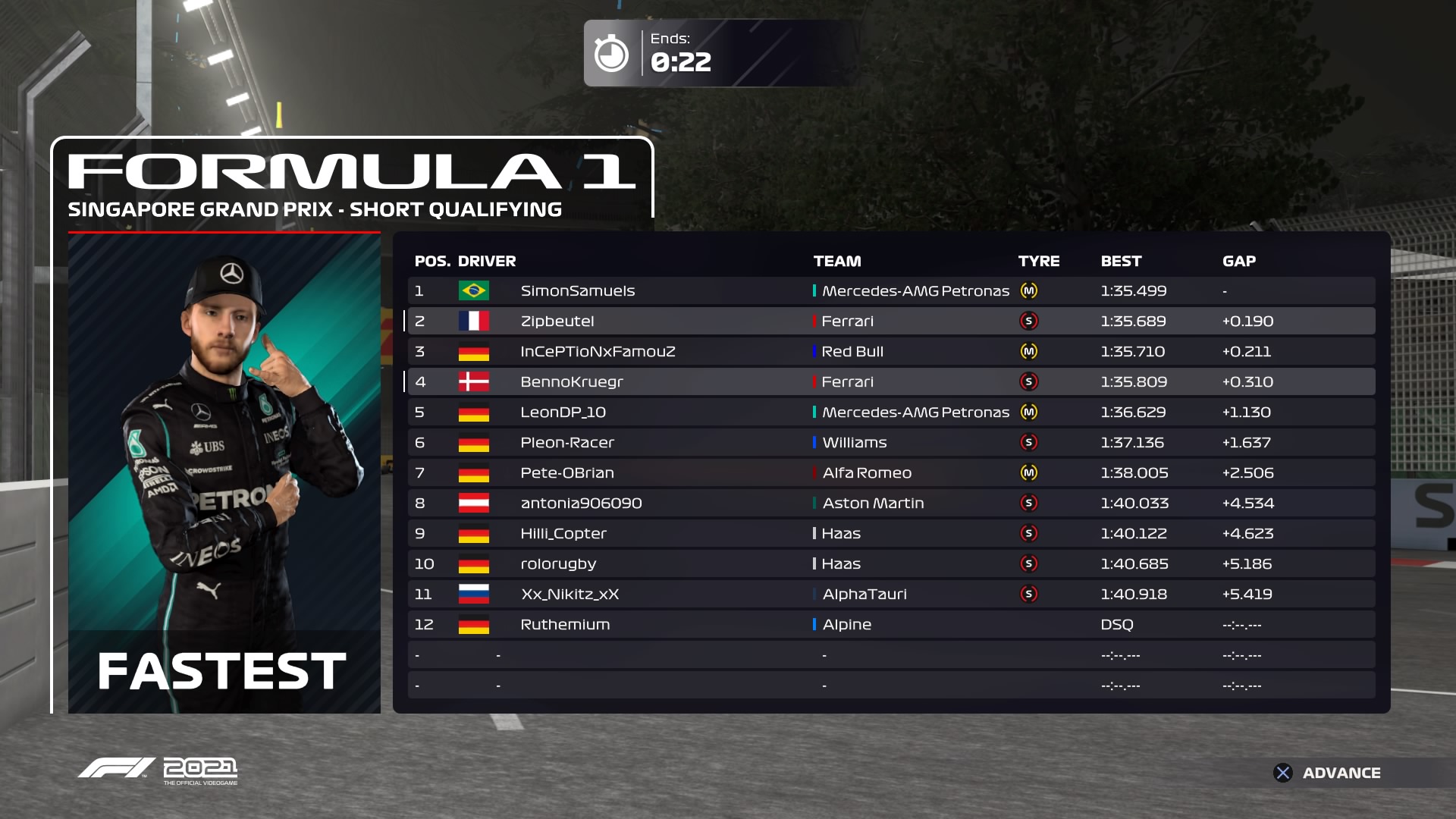Rennen: Die ersten Runden waren wie erwartet schwer auf dem Medium. Das SC kam sehr gut für mich und hab spekuliert und bin rein. Auf Soft gegangen und die drei vor mir hatten Pech das das SC die direkt eingeblendet hat. Dadurch war ich direkt an ihnen dran, obwohl sie nochmal rein mussten. Simon wurde leider DSQ und Marcel2502 kam weit hinten raus. Fabsen entschied sich draußen zu bleiben also war ich P2 beim Restart. Konnte ihn dann schnell überholen und hab versucht einen Gap rauszufahren, weil nochmal rein musste. 10 Runden vor Schluss bin ich nochmal rein und dann hieß sie’s Quali Runden bis zum Ende. In der letzten Runde war ich dann an Marcel dran und konnte das Überholmanöver durchziehen mit DRS.