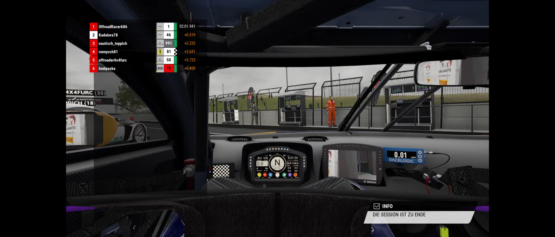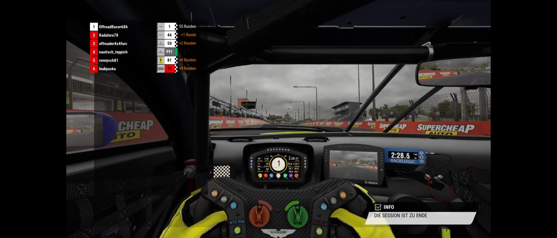 Rennen: ab ca 19:40 (2 Stunden Rennen mit x6 Multiplikator und Random Wetter. Ingame Startzeit: 12:00 Uhr.)