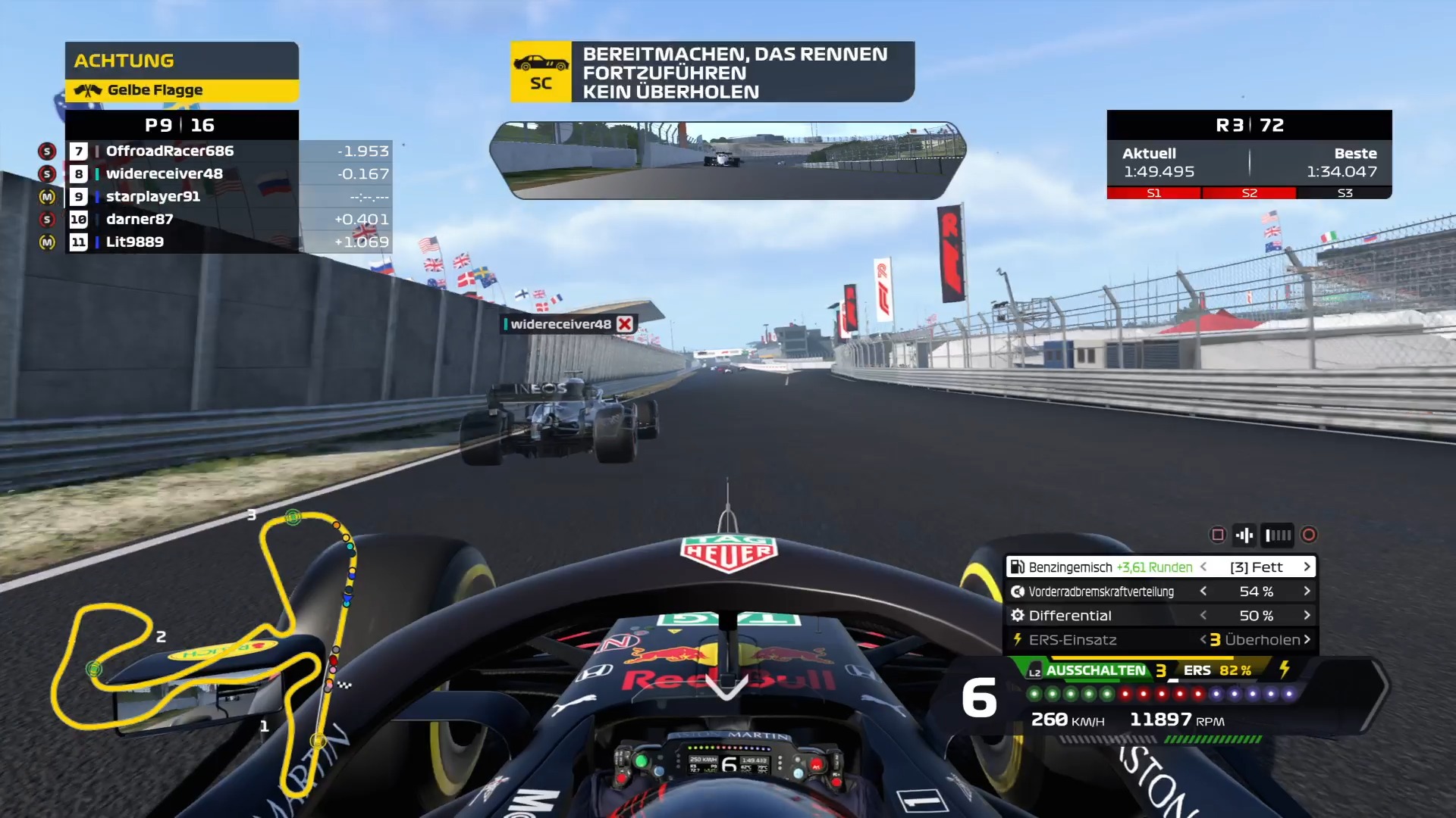 Aber durch den Ausfall von 2 Fahrern und das Überholmanöver gegen F300 (an der Box) war ich dann auf P11. Antonia906090 war dann auch noch ca. 10 Sekunden weg und ich versuchte trotz des beschissenen Fahrverhaltens noch mal alles aus der Karre rauszuholen, da plötzlich die Ersten Punkte in Sicht waren, was ich nach dem Crash zu Beginn und den 2 Runden Rückstand niemals gedacht hätte. Mit Antonia906090 hatte ich dann einige Runden noch ein kleines Scharmützel bis ich mich schließlich auf P10 überholen konnte. Ich musste weiterhin mich anstrengen das Auto auf der Strecke zu halten, da ich nach dem Ausfall eines weiteren Kollegen gerne P9 behalten würde. Mit dem Auto war es aber leider nicht möglich gewesen, ich konnte noch überraschend lange den Vorsprung auf F300 halten, aber als er dann vorbei war habe ich dementsprechend Tempo rausgenommen und bin nicht mehr so auf Krampf gefahren und ins Ziel.