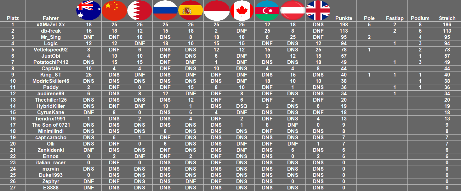 Naja viele die mich kennen wissen was dann bei mir hier schon wieder los war. Ohne Flügel dann auf den Weg zur Box gemacht als 18er. Wollte eigendlich bei Stop sofort auf Soft gehen. Habe mich aber kurz vorher dann doch für Super Soft entschieden und habe ab da an ansich nur noch Schadensbegrenzung betrieben. Habe mich bis zum nächsten Stop auf P10 vorarbeiten könne. Bin dann noch mal rein. Jeff fing zu dem Zeitpunkt an mich tierisch zu nerven . Der Wollte das ich noch zweimal stoppe. Nix da . Das kam für mich nicht mehr in frage. Ich nahm dieses mal die Soft und ging auf meine letzten Runden bis ins Ziel . Hab dem zweiten Stop sind mein Teamkollege und ich fast immer zusammen rum gekurvt. Er hatt natürlich den Reifenvorteil wo mit ich mich auch nicht alzu doll gewehrt habe als er vorbei ging. Am Ende macht ich noch mal ein paar fehler und Obi kam bis auf unter 1 sek an mich ran. Ich hatte zu dem Zeit Punkt 9 sek Zeitstrafe gesammelt. Ich habe gehofft das er auch Zeitstrafen hat . Diese hat er auch gehabt und zwar 2x5 sek. Doch wurde er wie ob schon erwähnt vor mir gewertet, obwohl ich vor ihm ins Ziel gefahren bin.