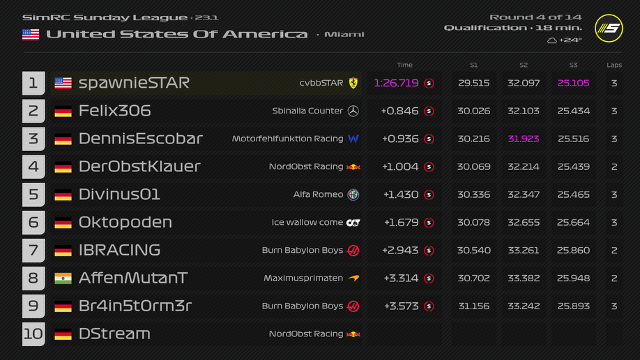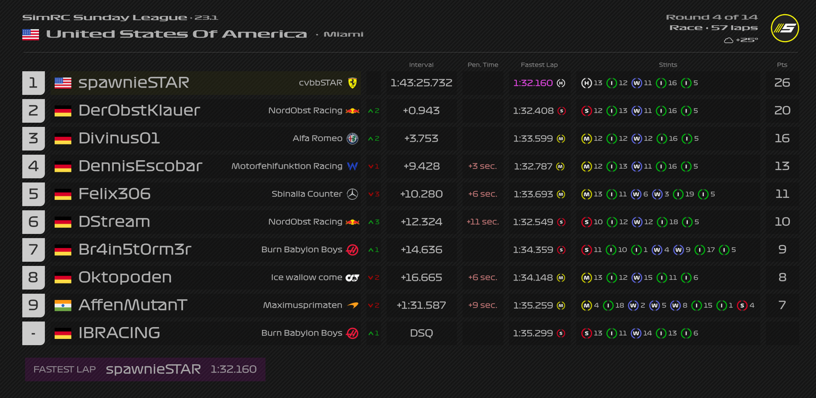 Runde 5: Sn0w verhielt sich kurz vor dem Restart des Rennens nicht unberechenbar. Auch sein Delta vergrößerte sich nicht ausschlaggebend/besonders auffällig. Währenddessen fuhr DStream ohne erkennbaren Grund auf Sn0w auf, sodass dieser einen Schaden am Heckflügel davontrug und später aufgrund dessen das Fahrzeug abstellte. Folglich sprechen wir gegen DStream für das grob fahrlässige Verursachen einer Kollision eine Strafe von 20 Sekunden sowie eine Qualisperre aus.